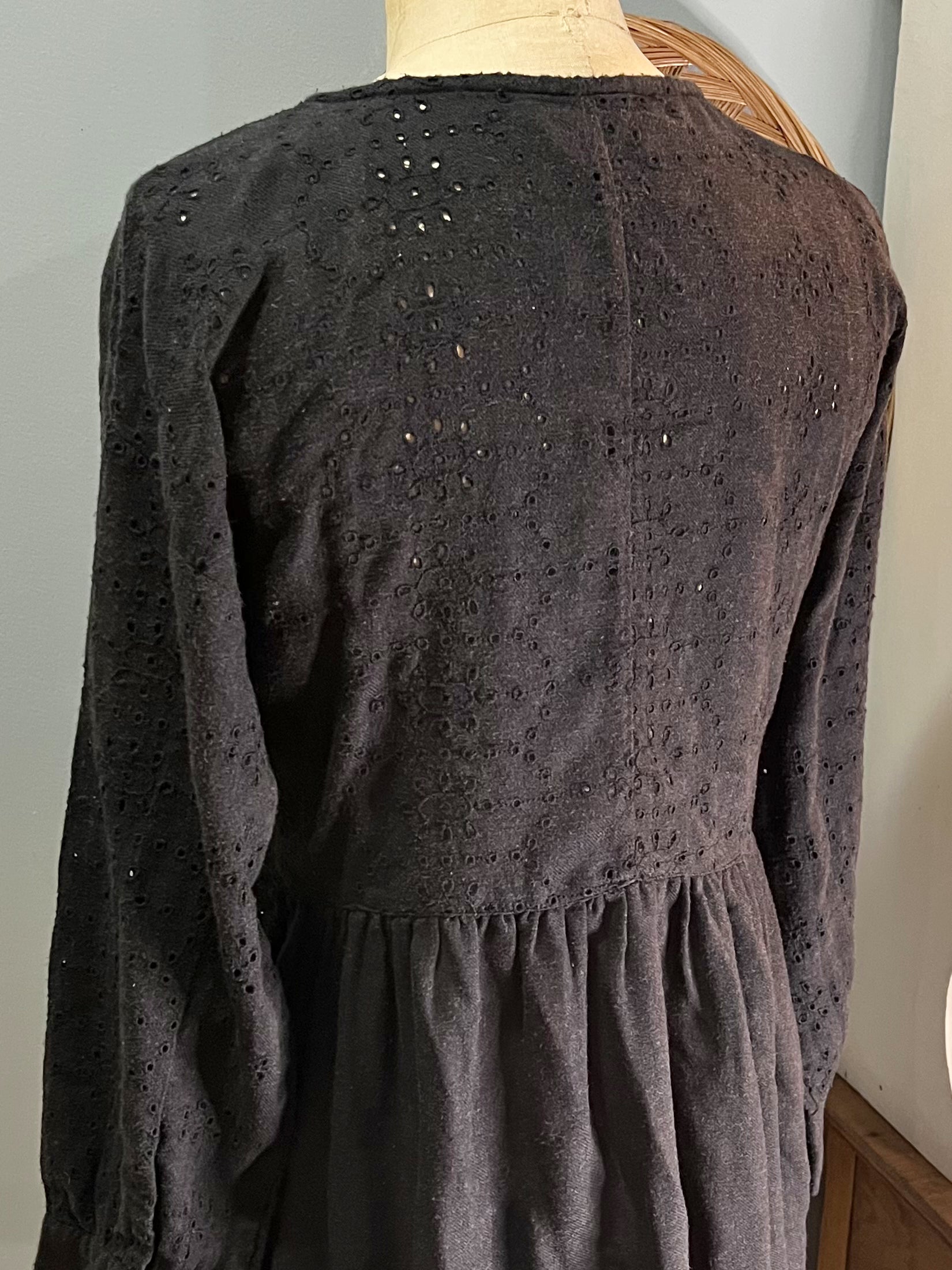 The Casey Eyelet Dress captures that timeless charm of vintage-inspired design with its delicate open eyelet detailing across the front, back, and sleeves. This X-Small piece features a romantic pom pom accent at the empire seam, paired with a classic crew neckline and long sleeves finished with button cuffs and subtle vents. Crafted from a soft cotton-polyester blend, the dress offers gentle comfort while the lined center front bodice panel provides structure. Perfect for those seeking an effortlessly feminine look with nostalgic appeal.