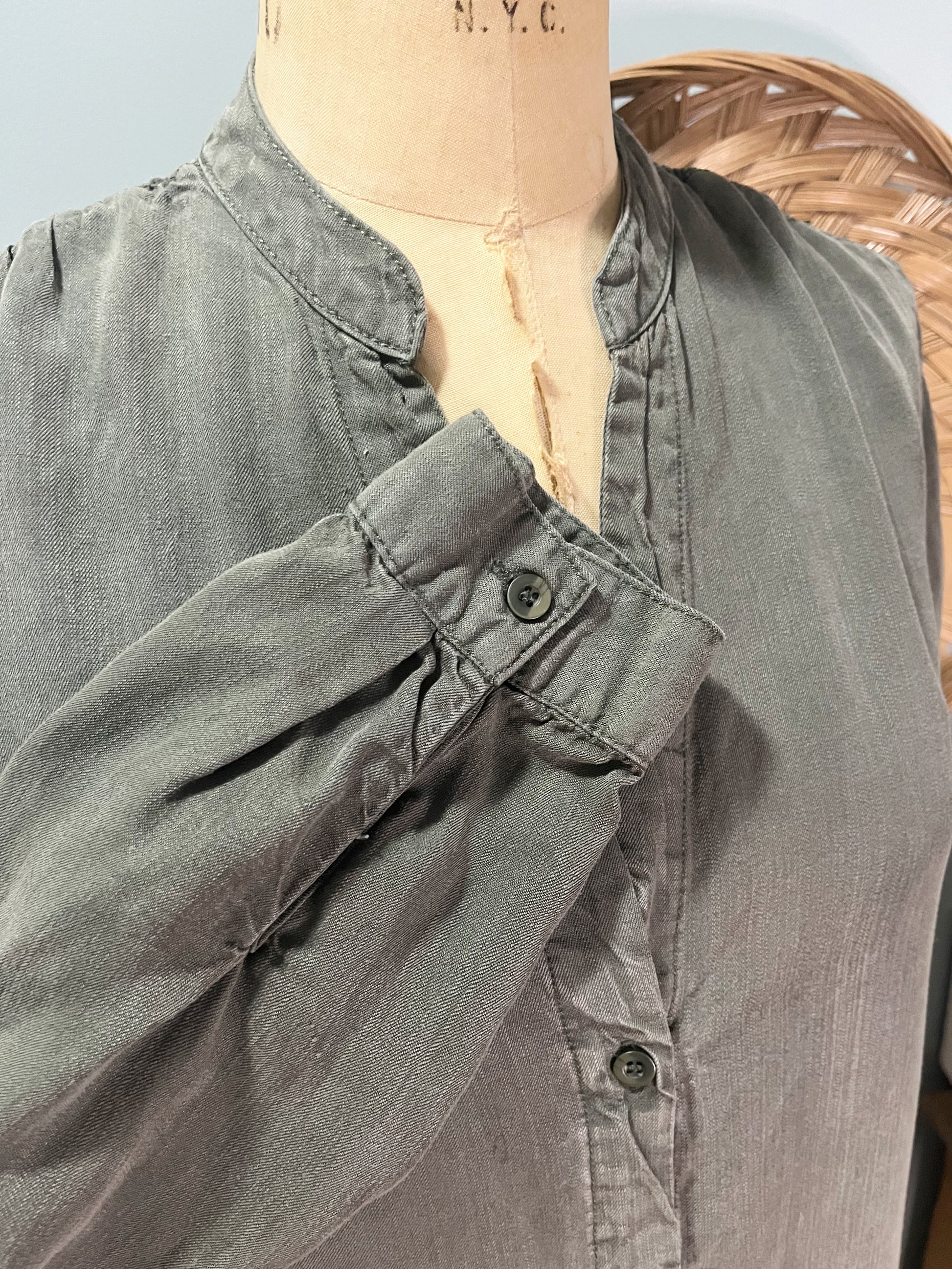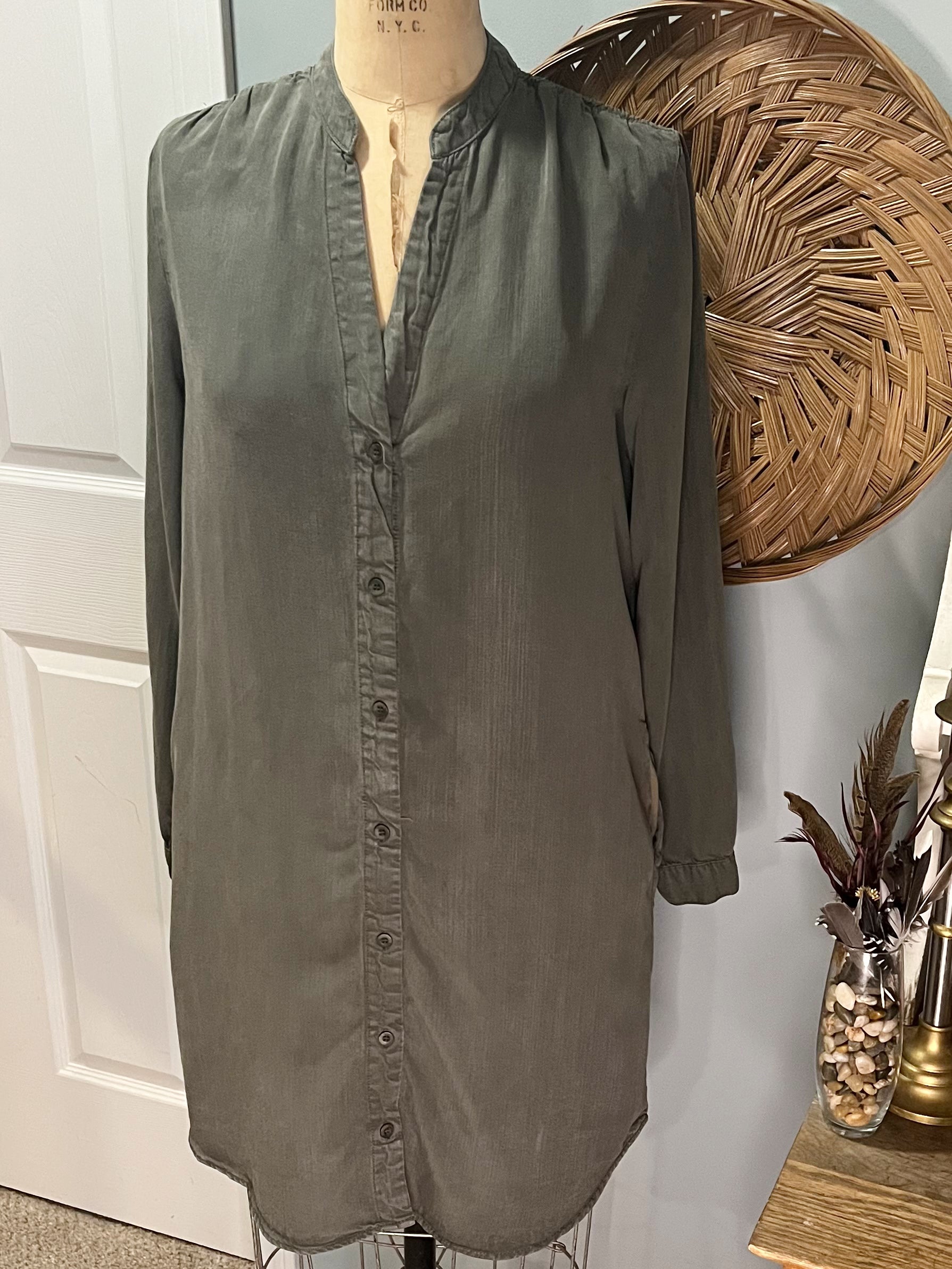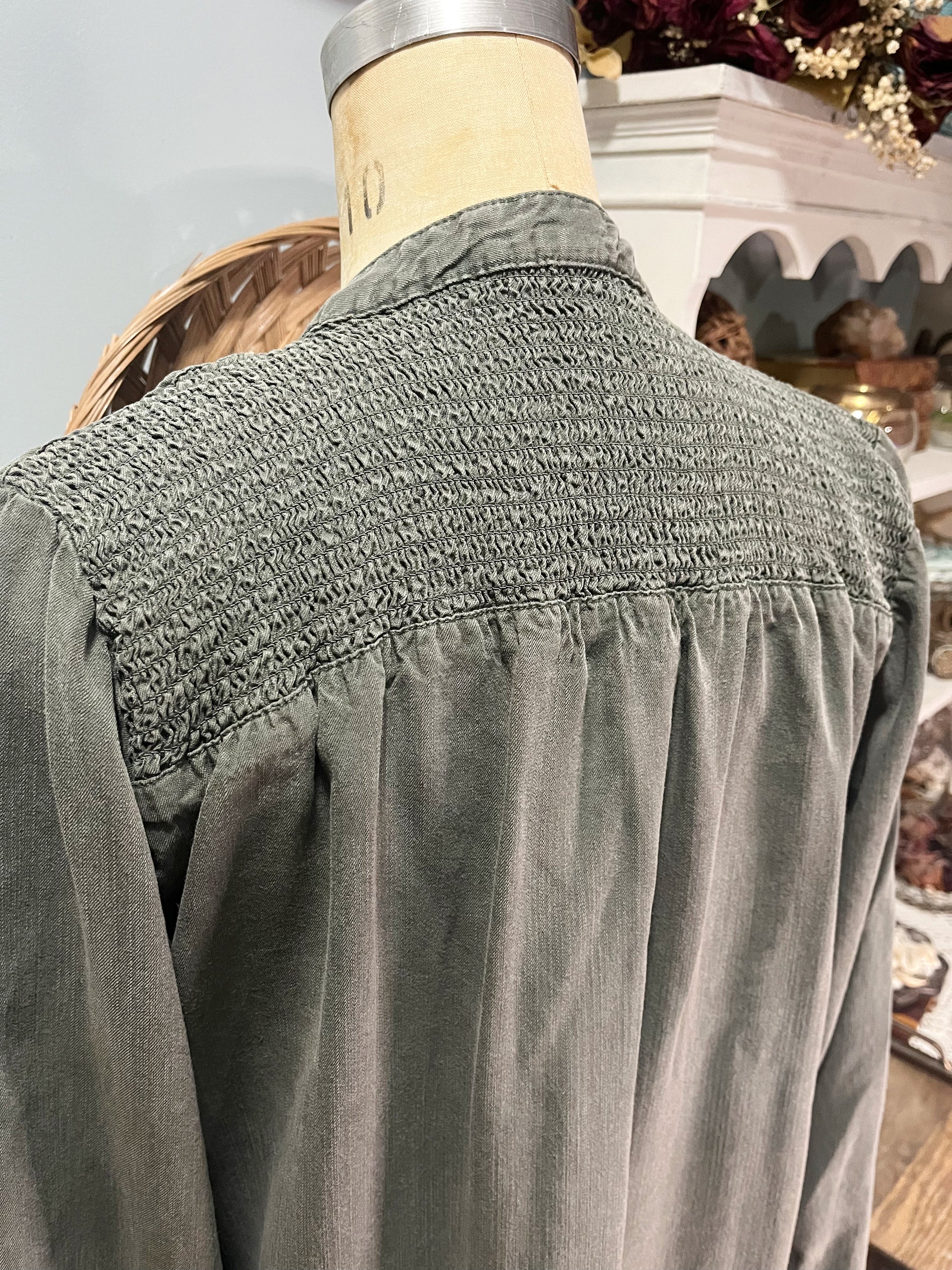 Effortlessly elegant, the Chelsea Dress captures timeless charm in soft sage green. This romantic piece features delicate smocking at the back yoke, long sleeves with button cuffs and vents, and practical side pockets. The classic shirt tail hem and button front create a vintage-inspired silhouette perfect for layering or wearing solo. Crafted by Velvet Heart, this size large dress blends nostalgic style with everyday wearability.