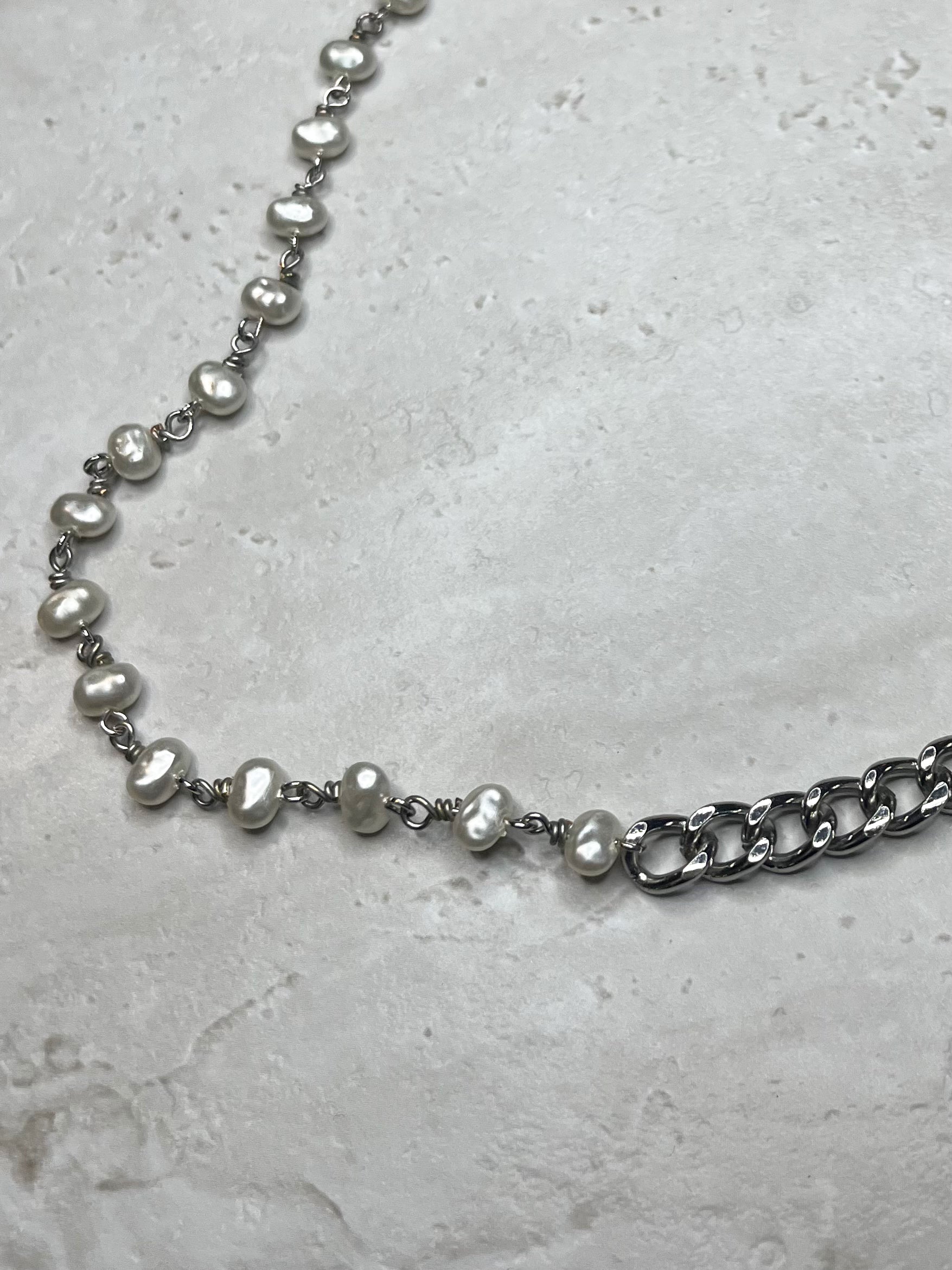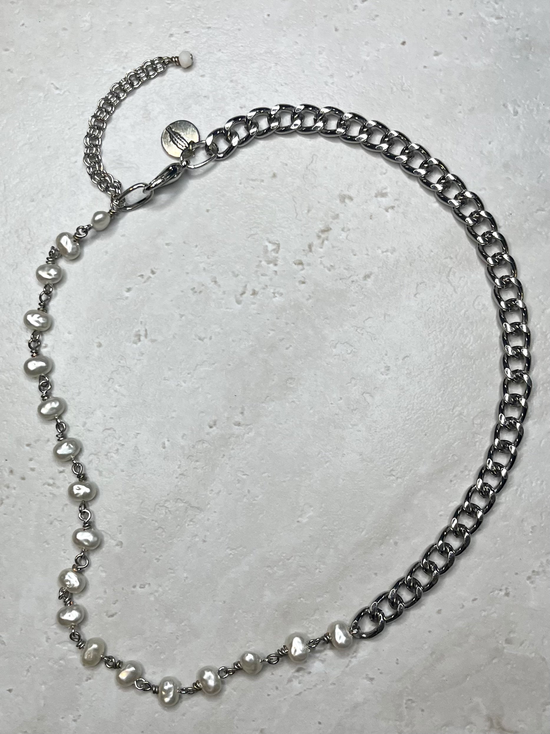 The Louise Necklace is a handcrafted piece that captures timeless elegance. Featuring a medium Cuban silver chain adorned with individually linked faux pearls, this necklace exudes vintage charm. A delicate feather logo charm adds a signature touch, while the secure lobster clasp ensures lasting wear. An extension chain with a matching gemstone at the end provides versatility for layering or adjusting the fit. Perfect for those who cherish artisanal craftsmanship and romantic, nostalgic style.