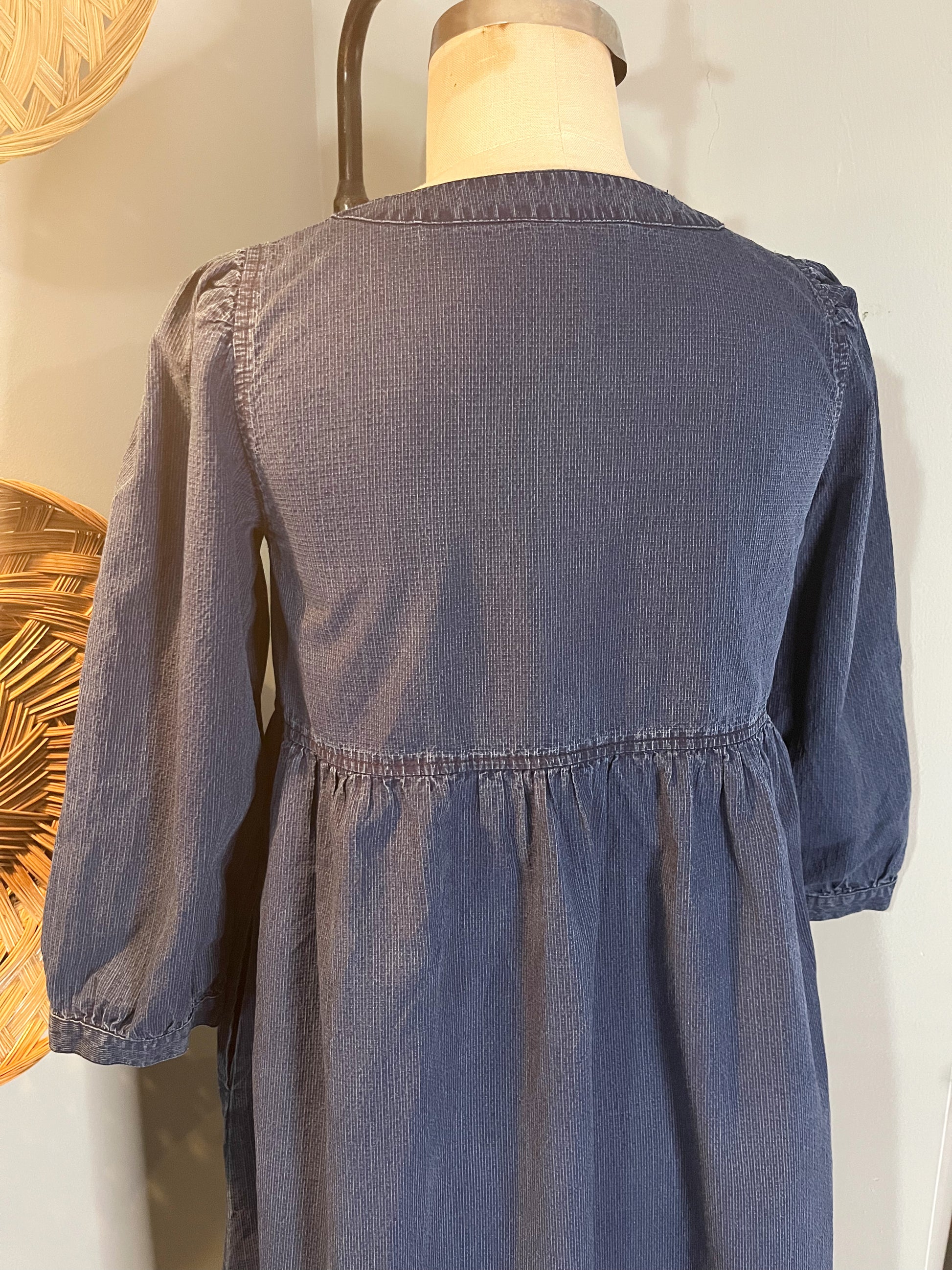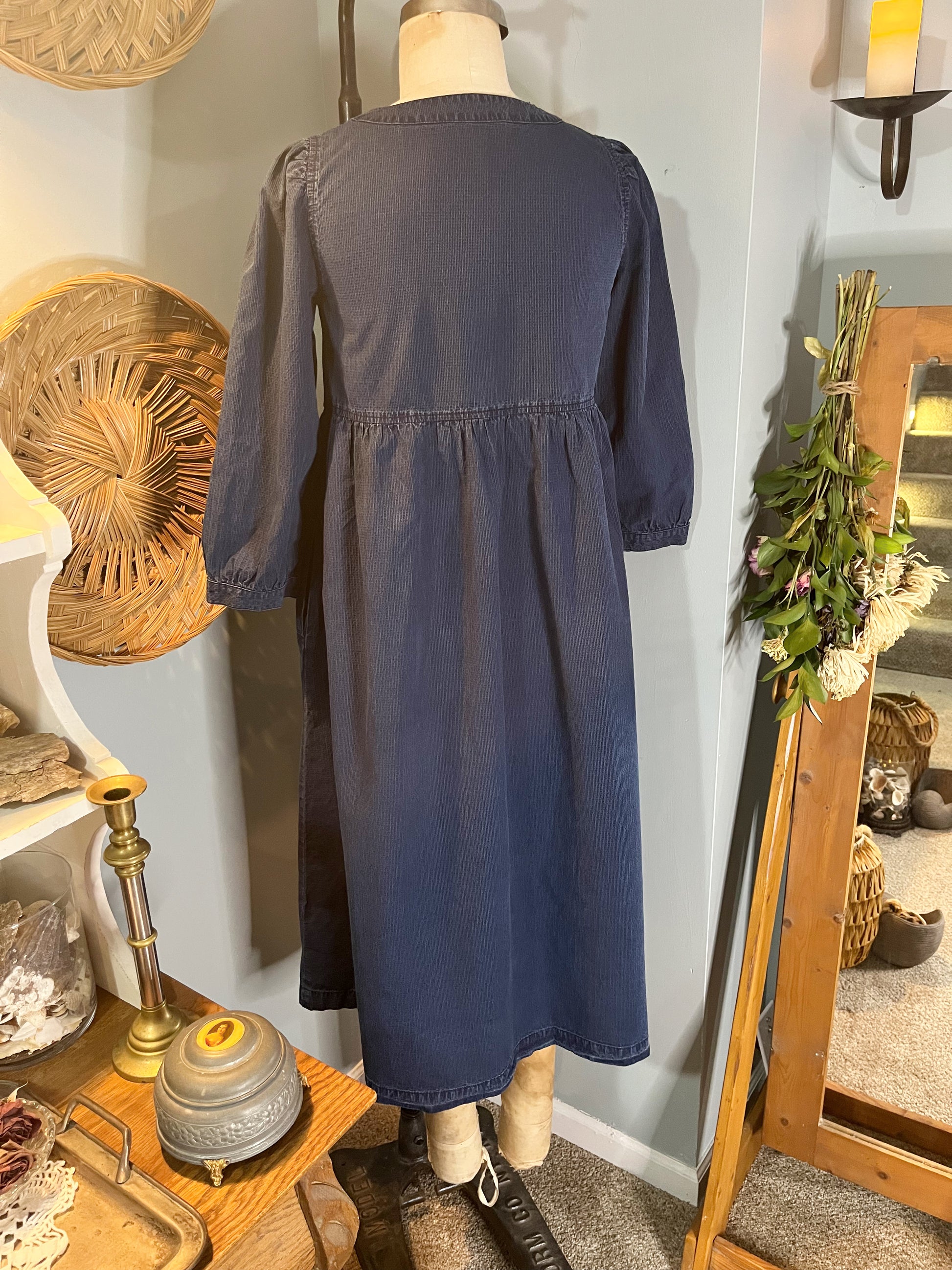 The Madalyn Dress captures effortless vintage charm in a lightweight textured denim. This midi-length beauty by Madewell features a flattering mid-V neckline with delicate topstitching, paired with three-quarter shirred sleeves that frame the arms with romantic detail. An empire waist seam with shirring creates a dreamy silhouette, while functional pockets add everyday practicality. The unlined construction keeps things breezy and comfortable, making it perfect for warm days when you want to feel both polished and carefree.