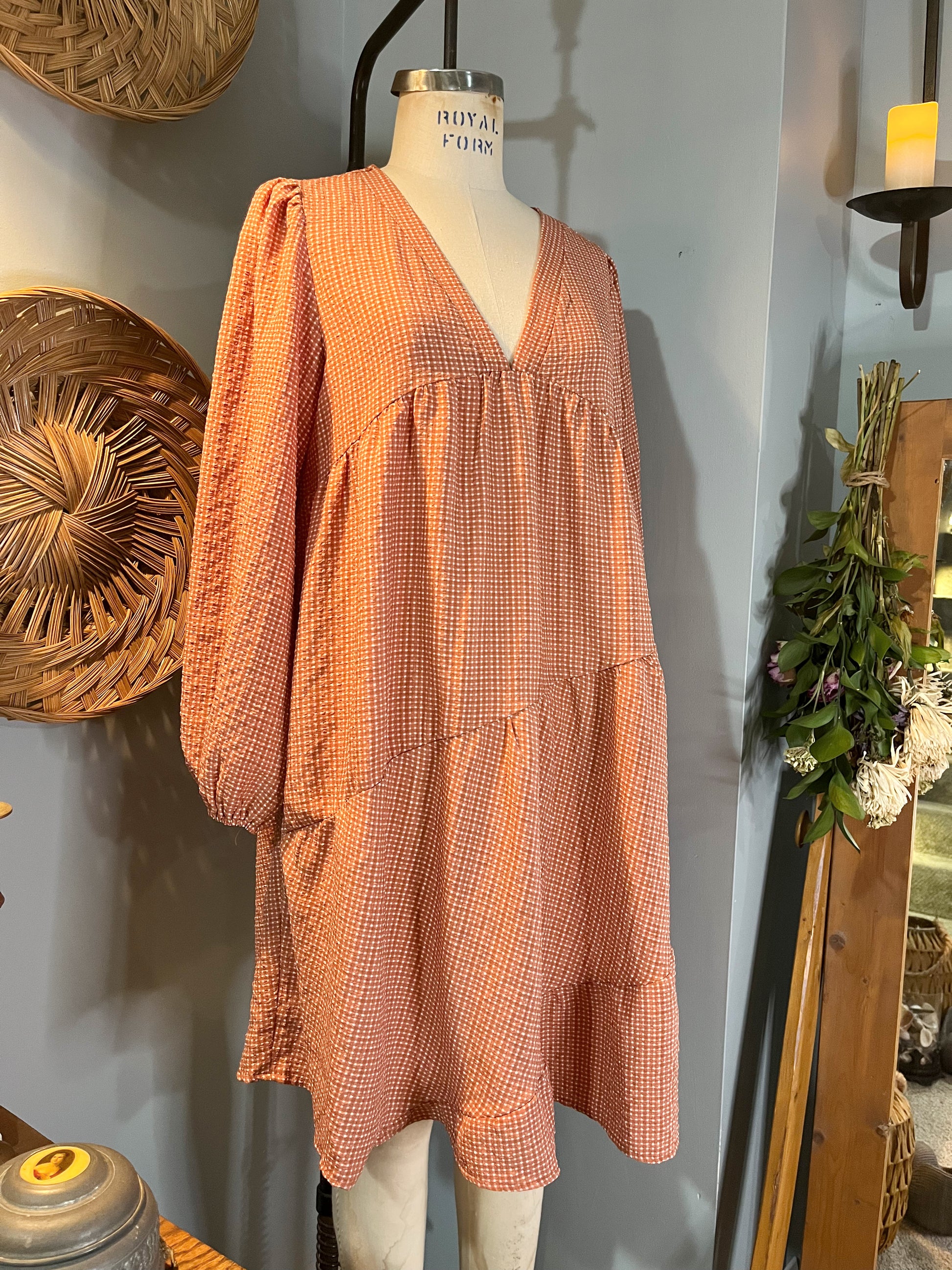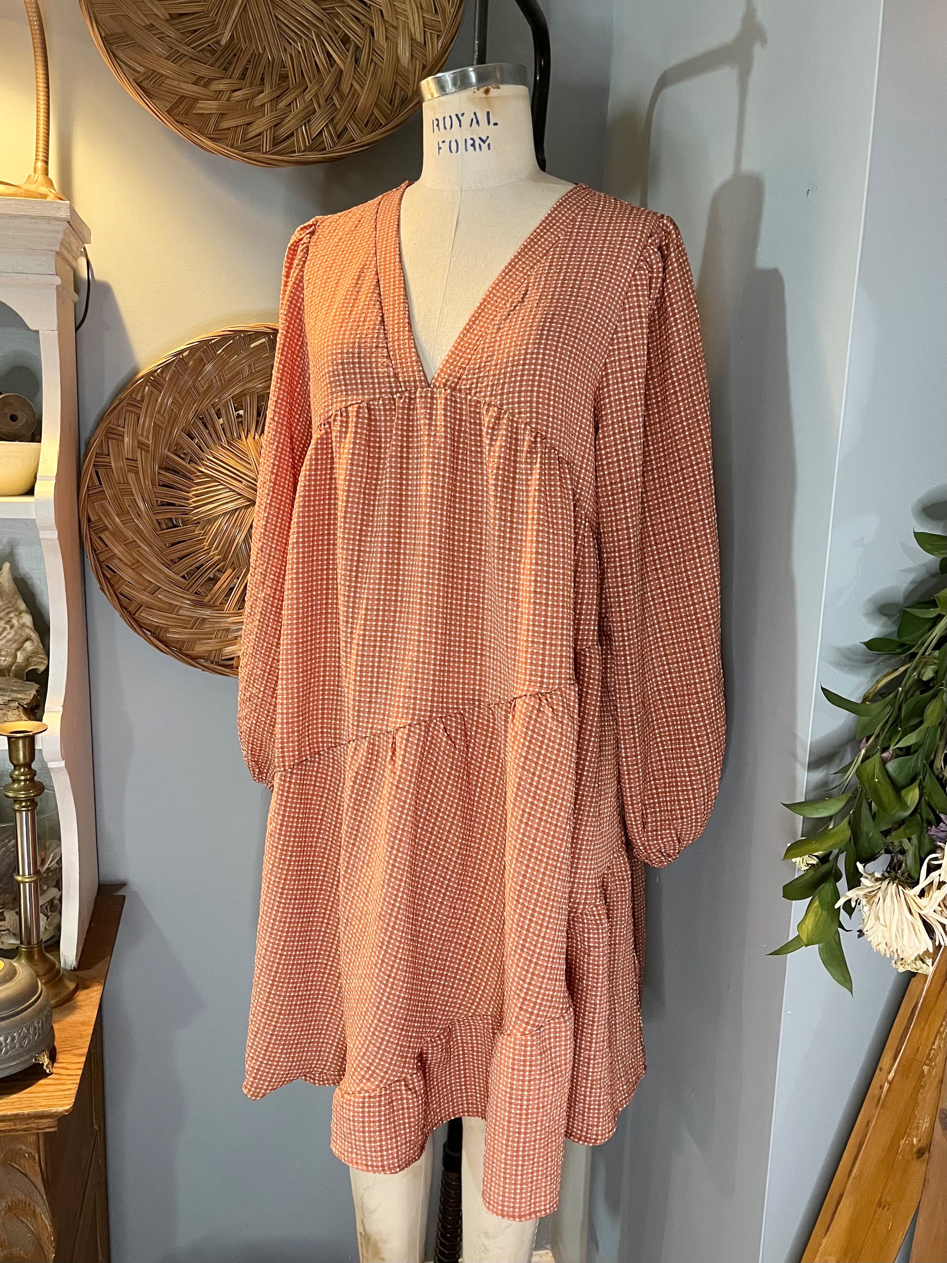 The Rowan Dress captures vintage charm with its terra cotta mini gingham print and delicate construction details. This romantic piece features a banded front V-neckline paired with a keyhole back closure and pearlized button accent. Shirred full sleeves with elastic finishing create an ethereal silhouette, while the empire seam and cascading asymmetrical shirred tiers add movement and dimension throughout. Crafted from soft polyester textured fabric and unlined for breathable comfort, this Mittoshop design evokes timeless elegance perfect for those who cherish nostalgic, feminine style.